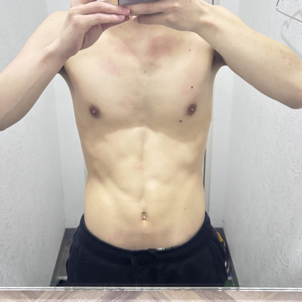 筋トレ開始時が55kgで、半年で61kgと6kgの増量に成功しました!! 正面からだと筋肉ついたのが少しわかりにくいのですが、斜めからのアングルだと胸周りに筋肉がついてきたのがわかります。